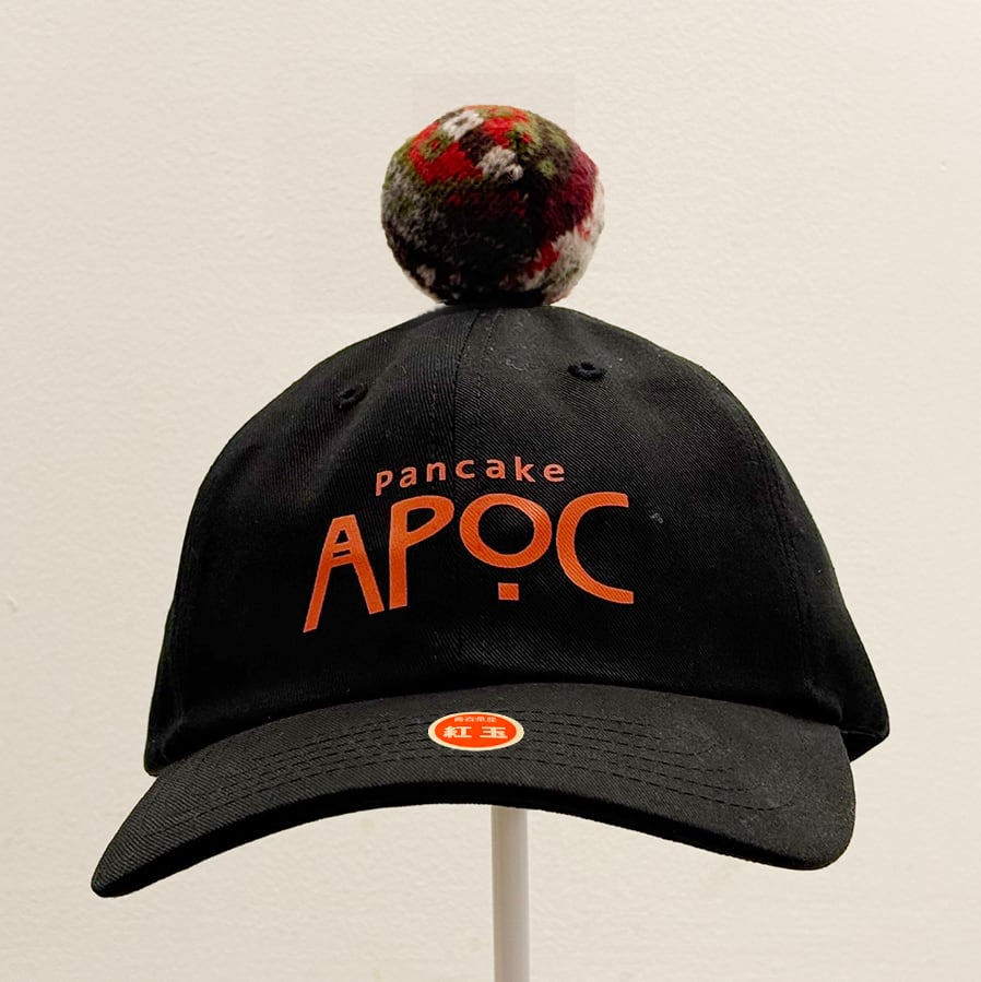 APOCのロゴと、青森産りんご「紅玉」または「サンふじ」のシールが付いたキャップ。