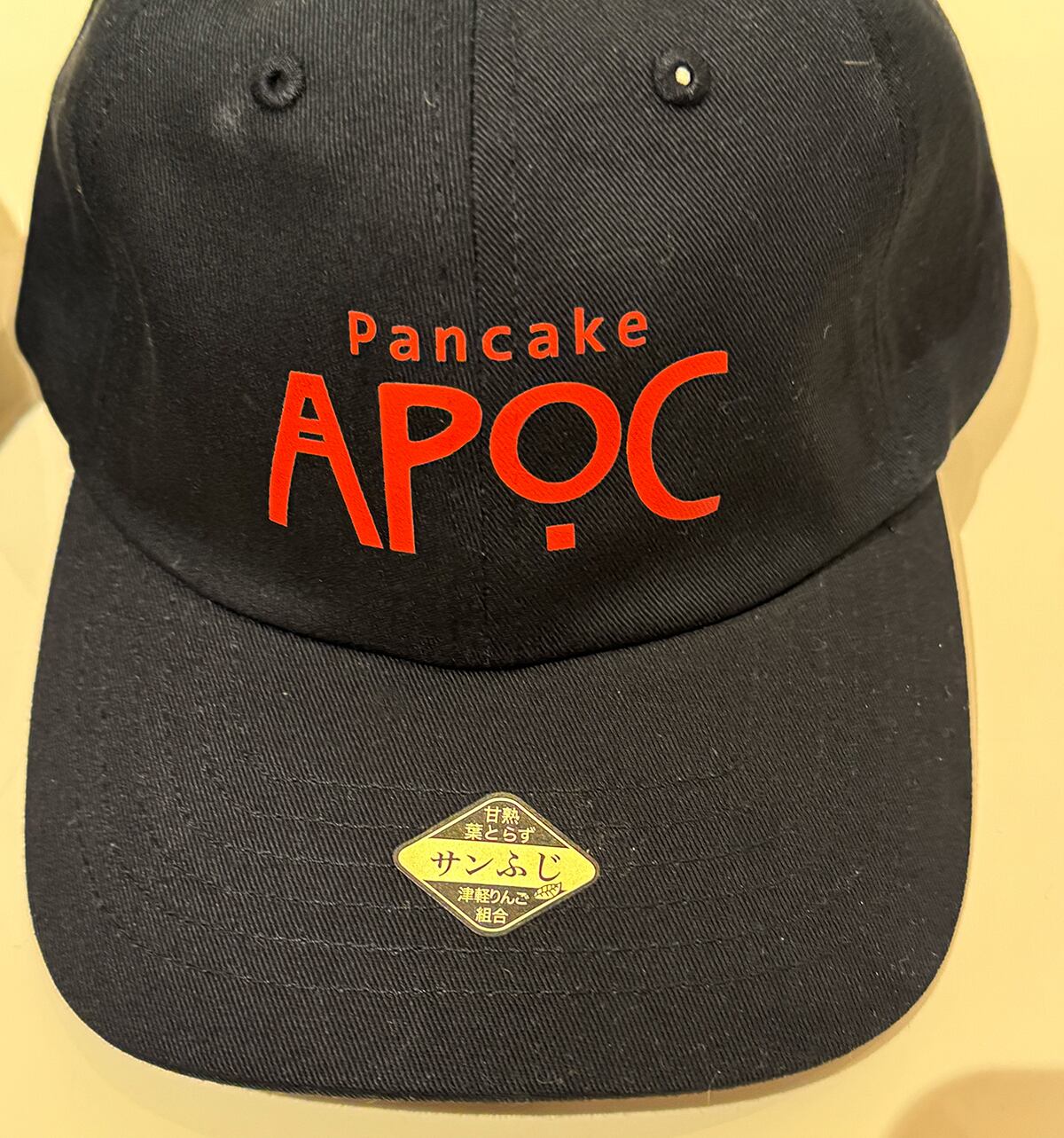 APOCのロゴと、青森産りんご「紅玉」または「サンふじ」のシールが付いたキャップ。